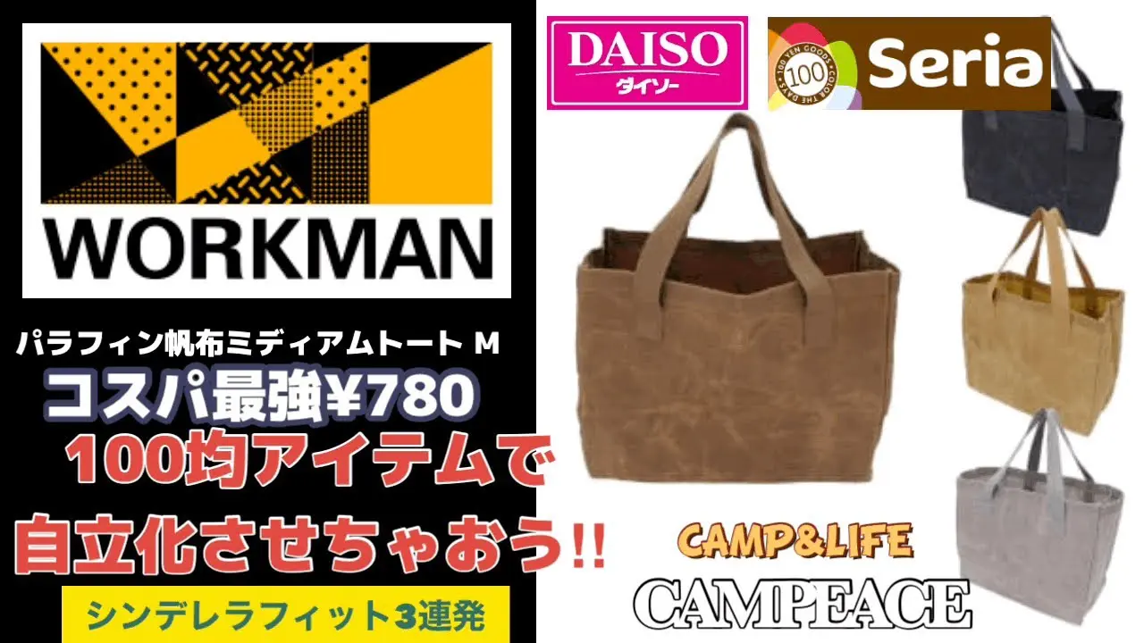 | タイトル | 【ワークマン】パラフィン帆布ミディアムトートM 100均ダイソーセリアアイテムがシンデレラフィット 蓋付き自立化‼︎ |