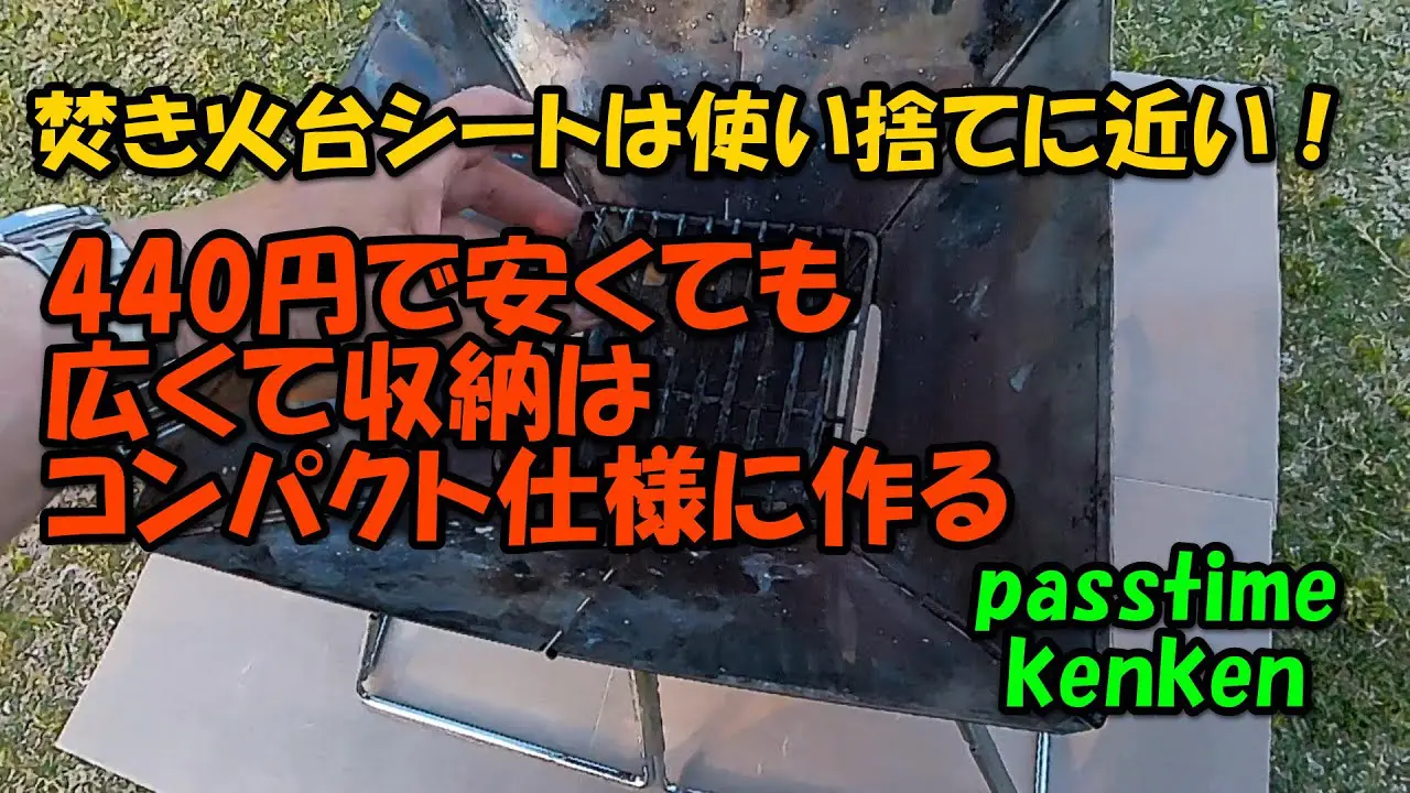 | タイトル | キャンプには必須? 100均商品では小さい焚き火台シートを440円で大きく収納はコンパクト仕様に作りました。 |