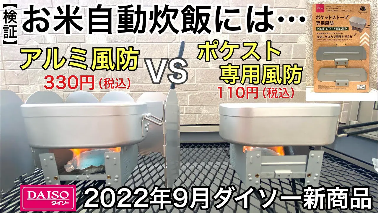 | タイトル | 【検証】2022年9月ダイソー新商品「ポケットストーブ専用風防(風除け)」お米自動炊飯はアルミ風防と比べてどう?【100均キャンプ用品】 |