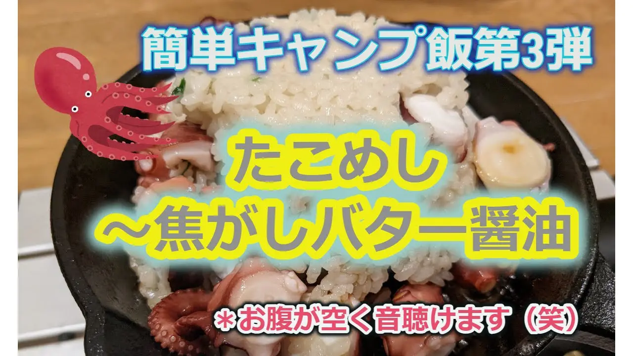 | タイトル | 【キャンプ飯】超簡単!100均スキレットで作る「たこめし~焦がしバター醤油~」 |